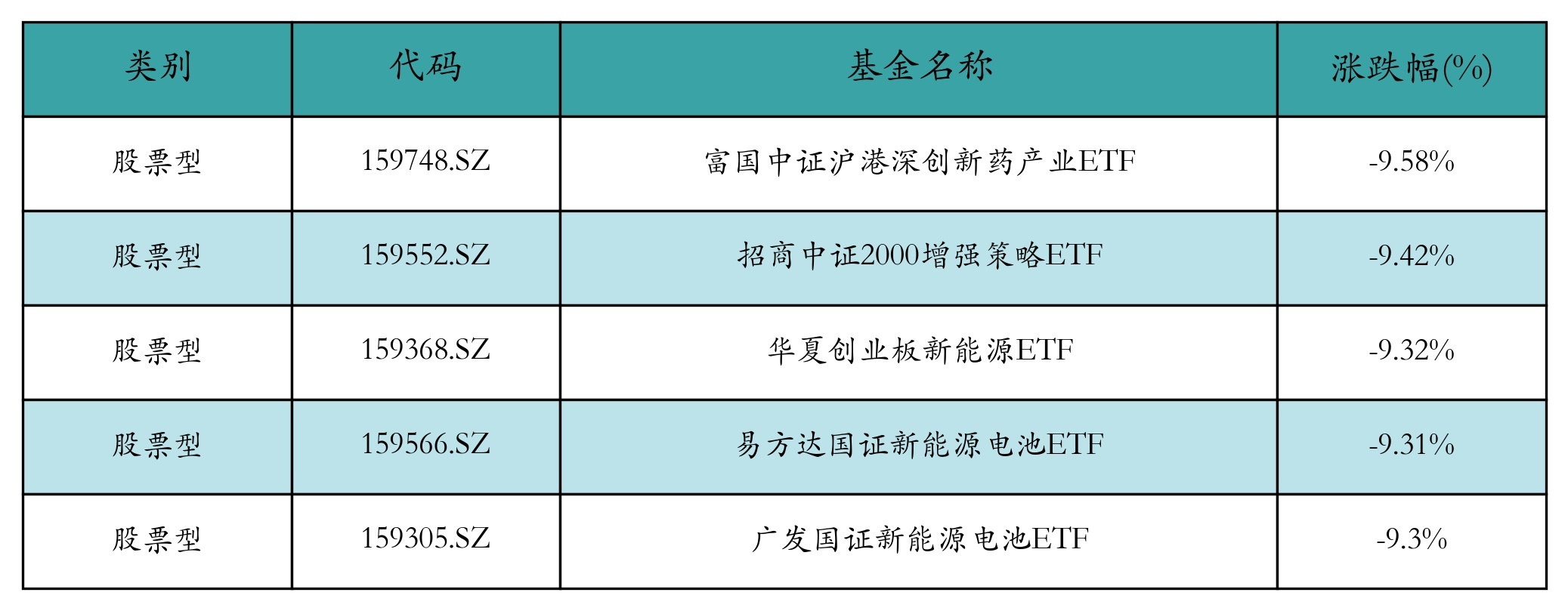 上周股票型ETF跌幅最大的5支ETF及其收益率分别为:富国中证沪港深创新药产业ETF(-9.58%)、招商中证2000增强策略ETF(-9.42%)、华夏创业板新能源ETF(-9.32%)、易方达国证新能源电池ETF(-9.31%)、广发国证新能源电池ETF(-9.3%)。详情见下表: