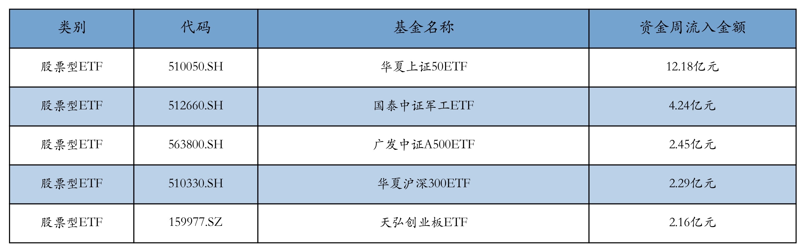 上周股票型ETF资金流入最多的5支ETF及其流入金额分别为:华夏上证50ETF(流入12.18亿元)、国泰中证军工ETF(流入4.24亿元)、广发中证A500ETF(流入2.45亿元)、华夏沪深300ETF(流入2.29亿元)、天弘创业板ETF(流入2.16亿元)。详情见下表:
