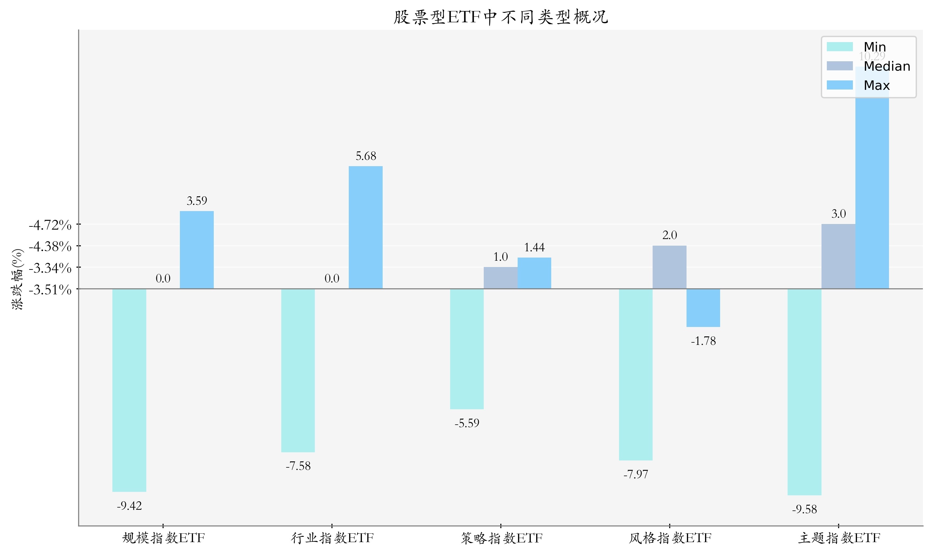 上周股票型ETF周度收益率中位数为-4.04%。其中按照不同分类,规模指数ETF中南方深证100ETF周度收益率最高,为3.59%;行业指数ETF中鹏华国证粮食产业ETF周度收益率最高,为5.68%;策略指数ETF中广发中证智选高股息策略ETF周度收益率最高,为1.44%;风格指数ETF中广发上证科创板成长ETF周度收益率最高,为-1.78%;主题指数ETF中华夏上证科创板半导体材料设备主题ETF周度收益率最高,为10.29%。
