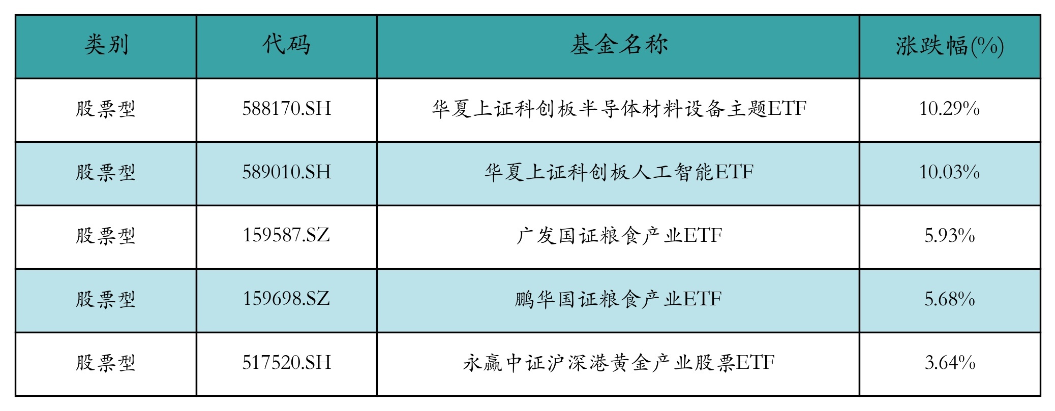 上周股票型ETF涨幅最高的5支ETF及其收益率分别为:华夏上证科创板半导体材料设备主题ETF(10.29%)、华夏上证科创板人工智能ETF(10.03%)、广发国证粮食产业ETF(5.93%)、鹏华国证粮食产业ETF(5.68%)、永赢中证沪深港黄金产业股票ETF(3.64%)。详情见下表: