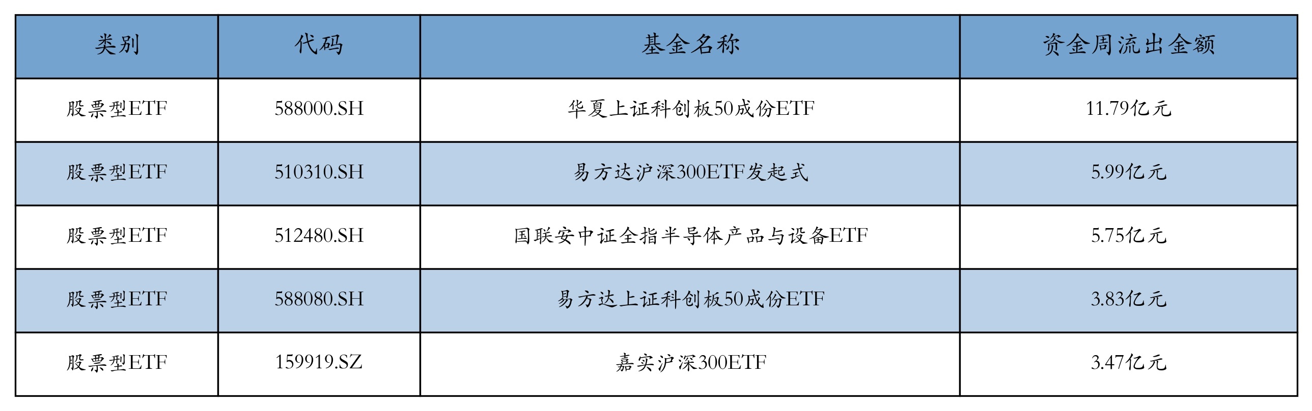 上周股票型ETF资金流出最多的5支ETF及其流出金额分别为:华夏上证科创板50成份ETF(流出11.79亿元)、易方达沪深300ETF发起式(流出5.99亿元)、国联安中证全指半导体产品与设备ETF(流出5.75亿元)、易方达上证科创板50成份ETF(流出3.83亿元)、嘉实沪深300ETF(流出3.47亿元)。详情见下表: